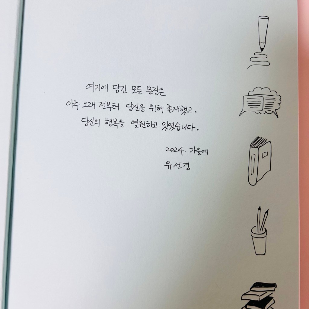 오늘 필사를 못했더라도 어떤 또 집중할 수 있는 날에 더 필사해볼 수도 있고, 오늘 한장을 다 적지 못할 정도로 기운 빠지는 날에도 괜찮습니다. 그저 적어보면서 나의 감정을 더 잘 갈무리하게 되고 일년을 돌아보며 이 책이 소중해지는 경험을 하게 될 것입니다.