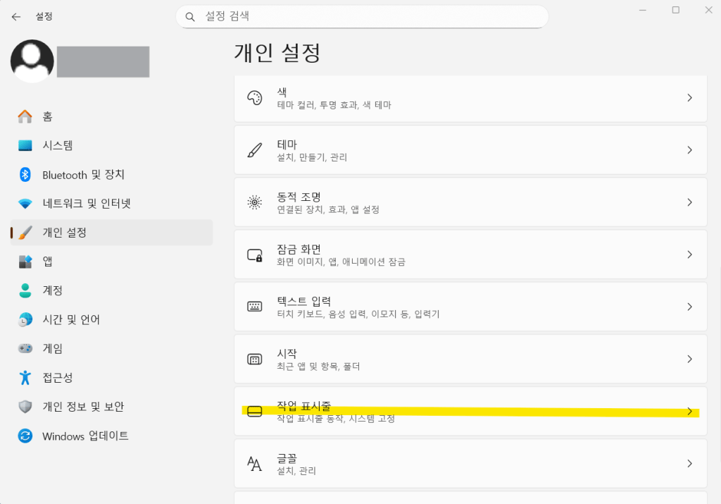 - 개인 설정 → 작업 표시줄