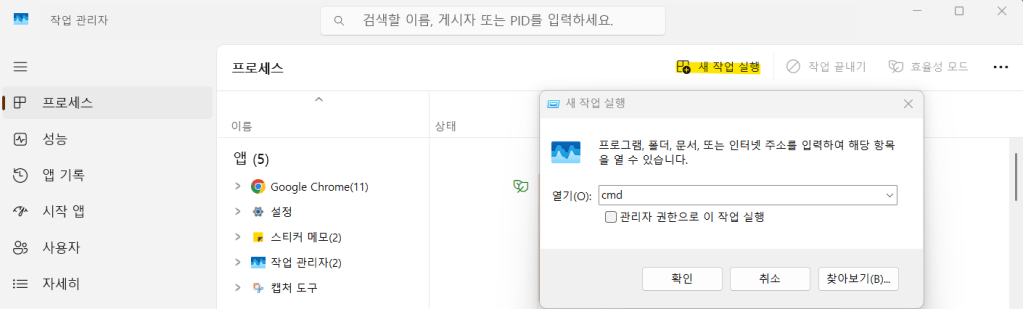 - 파일 → 새 작업 실행