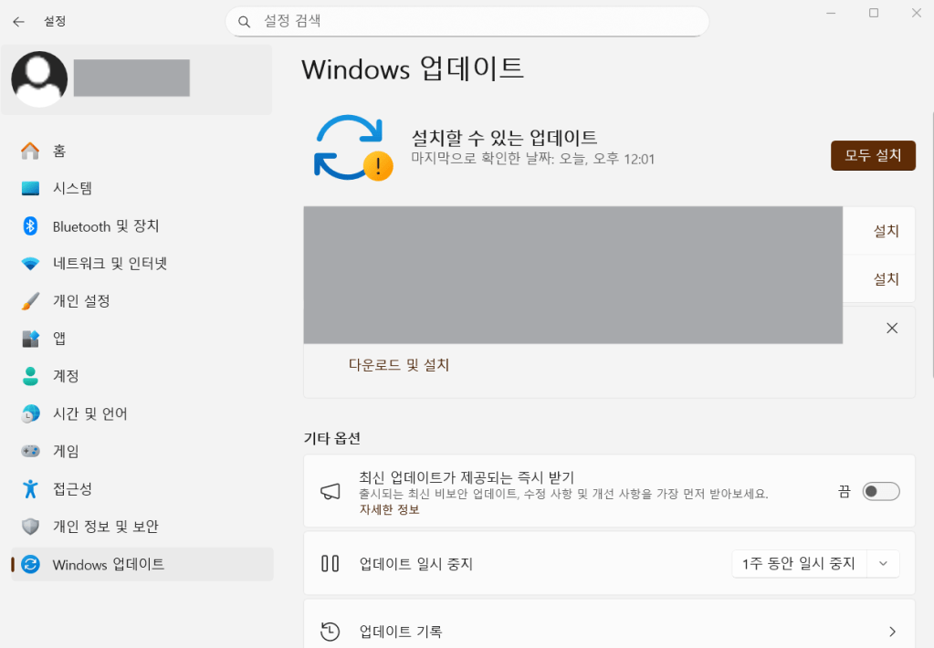 - 설정 → Windows 업데이트 → 업데이트 확인